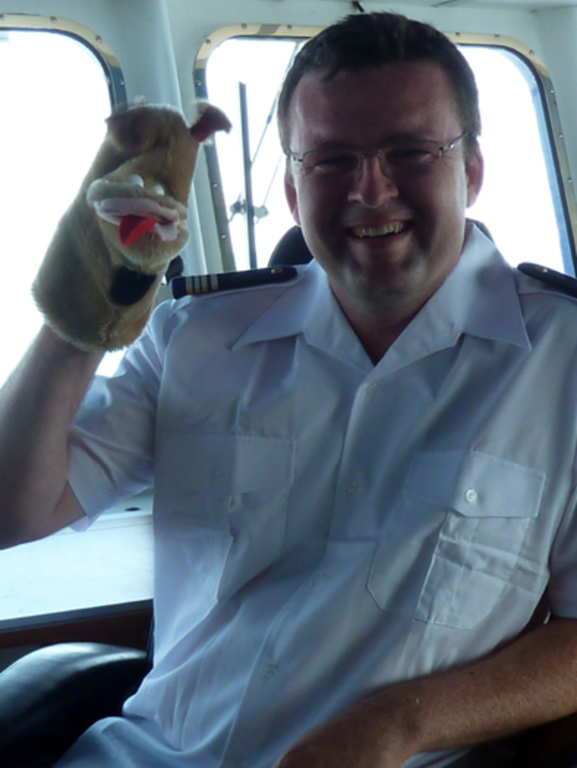 Il a commencé par tout en haut, au pont F. C’est le 6ème étage du bateau. Ça s’appelle la passerelle. C’est situé tout à l’avant. La vue est splendide et l’on voit très loin sur l’eau. C’est de là que l’on pilote L’Atalante. | Régis est le commandant, c’est le chef de tout l’équipage. Il est aidé dans son travail par le second capitaine et deux officiers. |