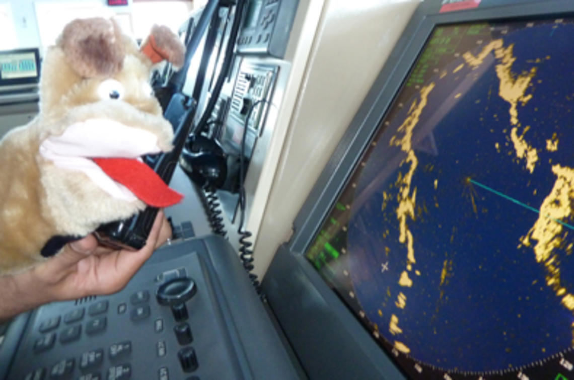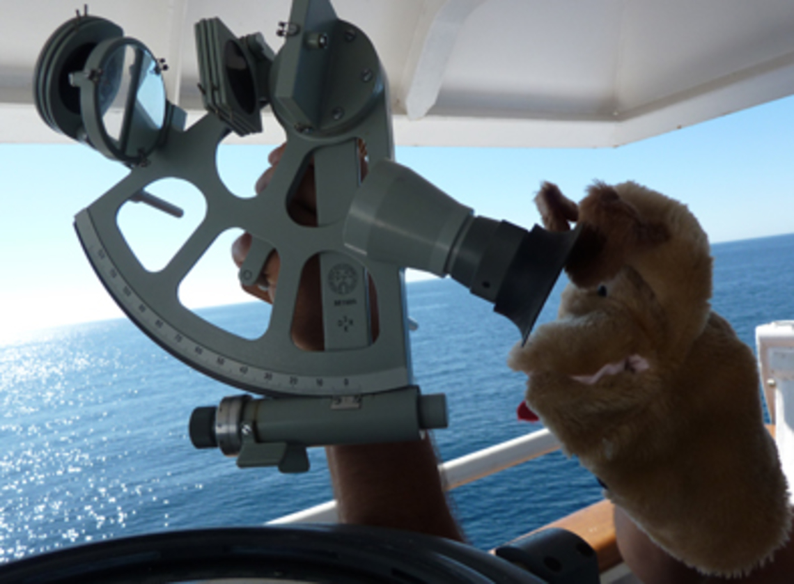Zubidule explore un peu. Il regarde l’écran du radar. C’est là que l’on voit s’il y a d’autres bateaux dans les parages. | Il a pu essayer un vieil instrument de navigation qui s’appelle le sextant. Il permet de savoir où on est sur la Terre en s’aidant des astres, comme le soleil. Maintenant, ce sont plutôt les satellites qui servent à positionner le bateau sur les cartes marines. |