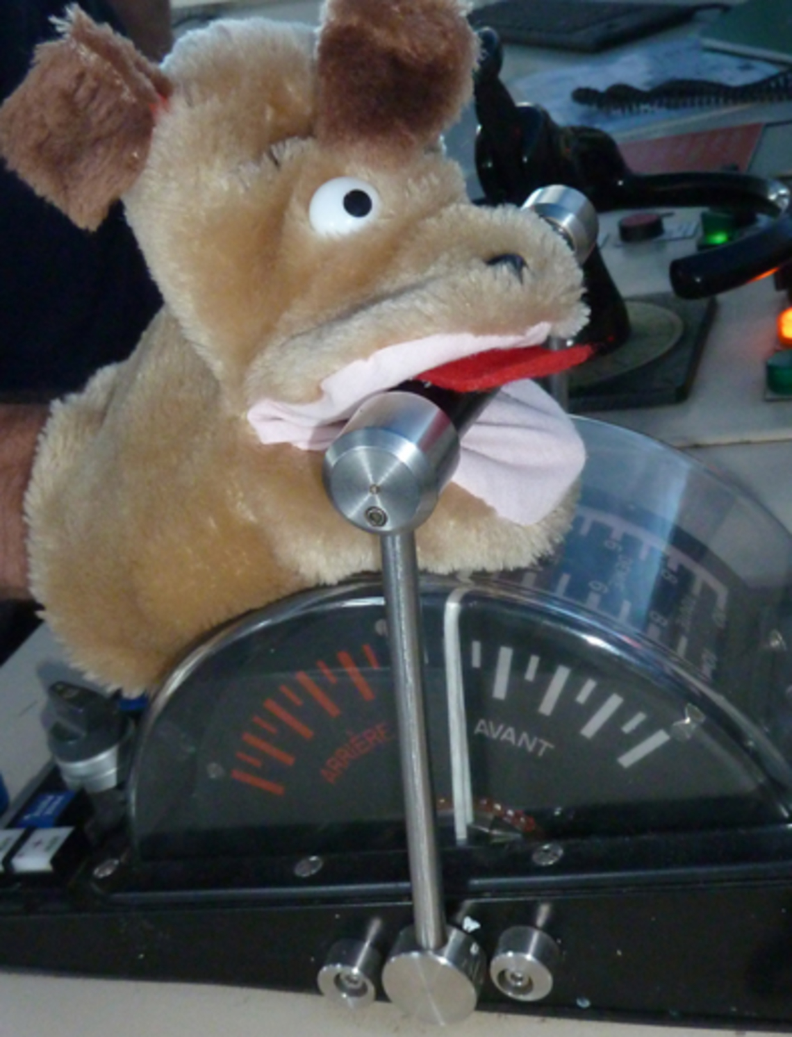 Zubidule a pu essayer de conduire le bateau… Quelle chance ! | Il a même pu faire accélérer les moteurs …avec une grosse manette. Vrrrrroummmm ! |