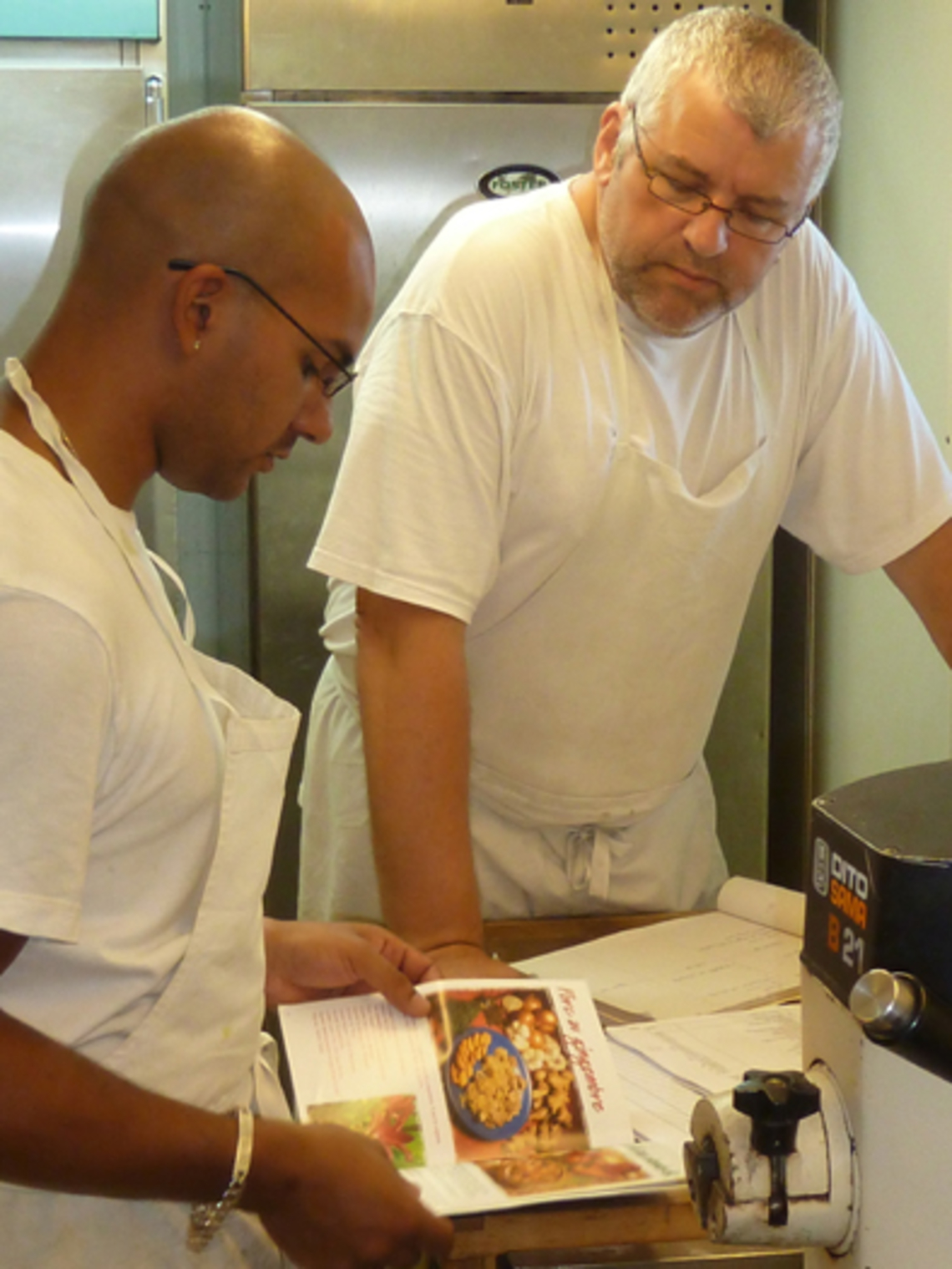 Il est aidé de Laurent, le second cuisinier (qui prépare ici des marquises) ... | ...et de Julien, le troisième cuisinier (qui montre ici une recette à Jacques !) |