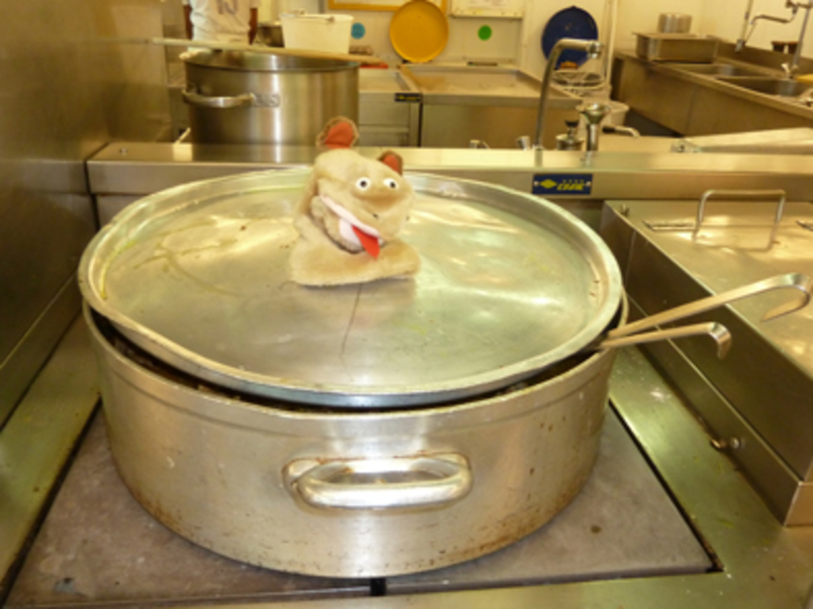 Zubidule poursuit sa visite de L’Atalante. Après la passerelle, il s’est rendu en cuisine. Hé oui, il y a une vraie cuisine sur le bateau ! Au contraire de la passerelle, la cuisine est située au pont B, l’un des endroits les moins secoués du bateau !
