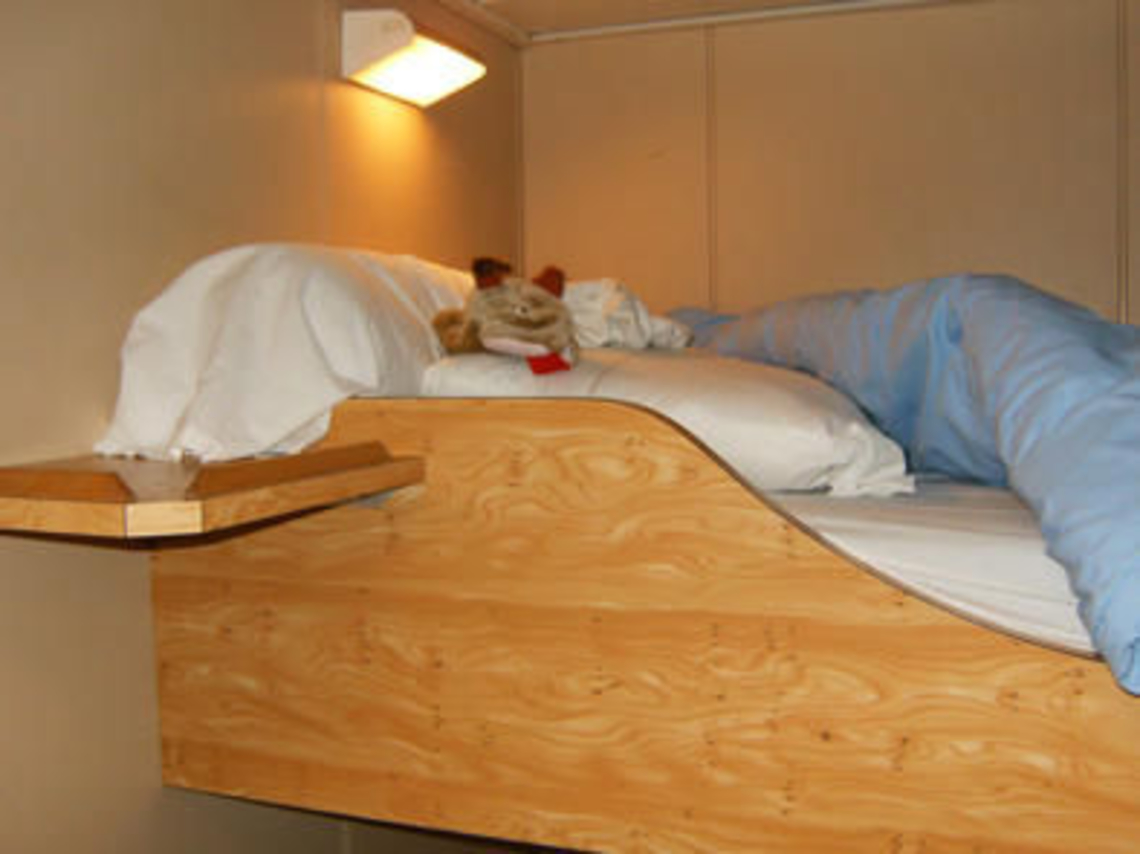 Le bateau L'Atalante nous y attendait. Nous avons chargé toutes les caisses que nous avions envoyées de Brest. | Zubidule a découvert la cabine où il allait dormir. C’est pas mal du tout ! |