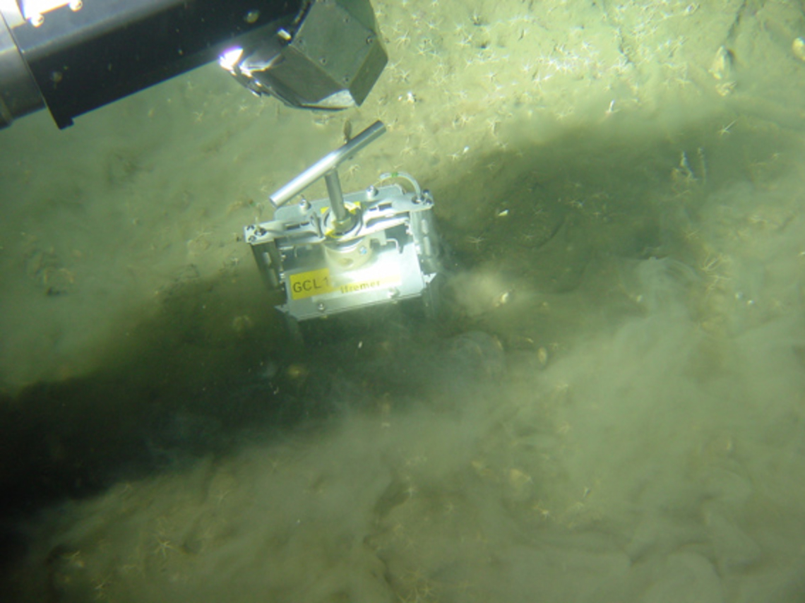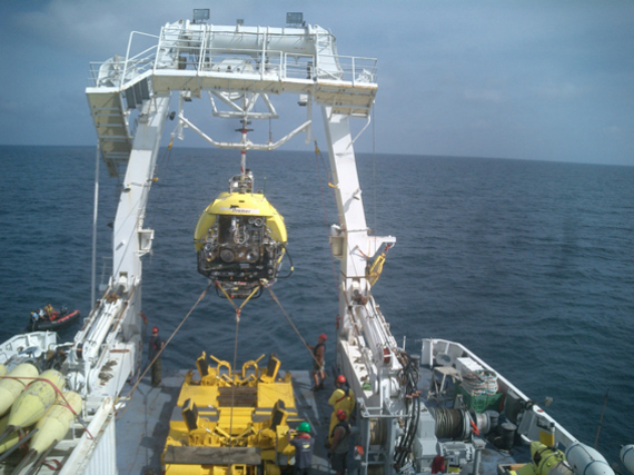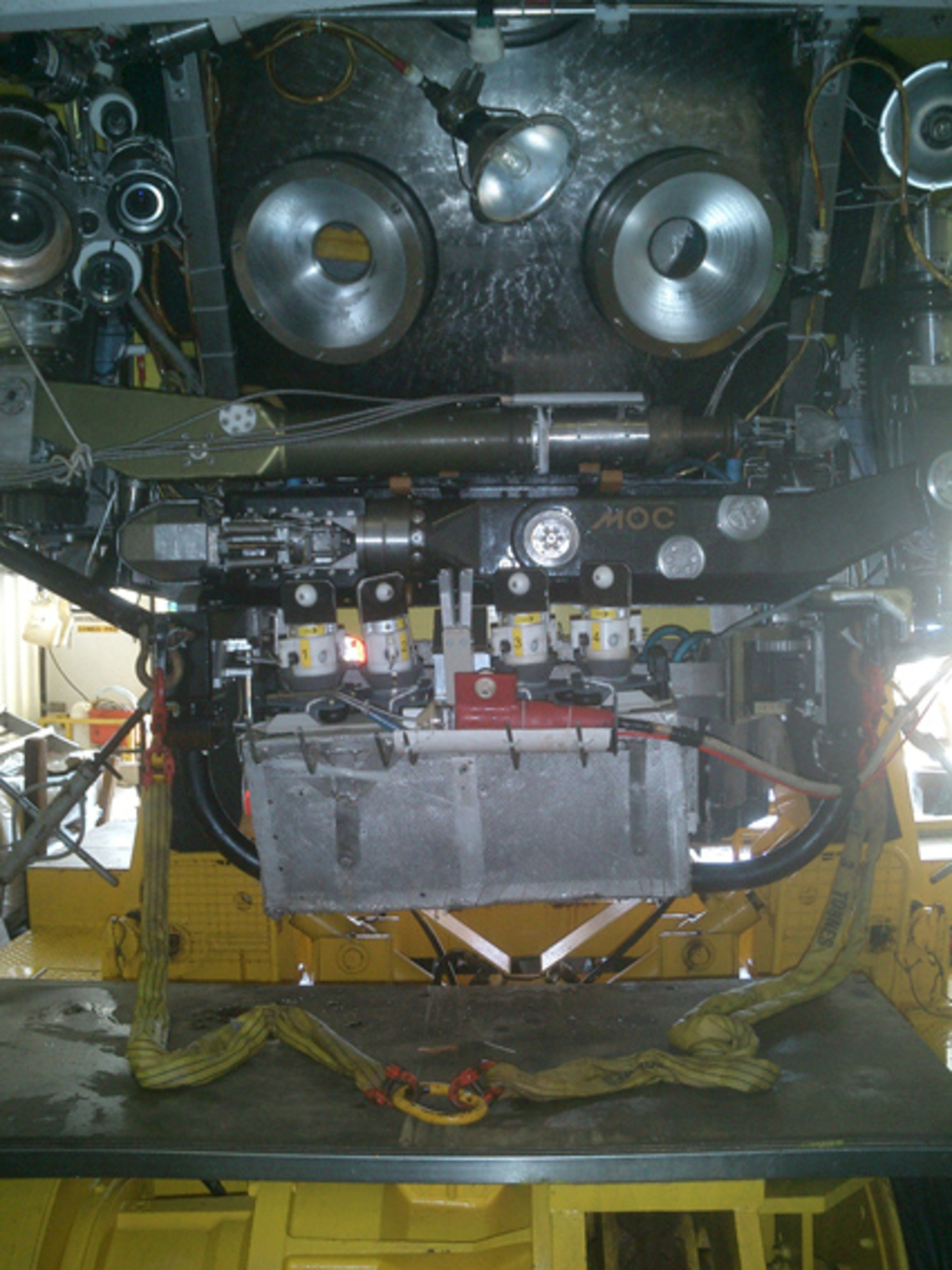 A simple vista es una pequeña muestra de roca, su peso más de 10 kg que regresarán en el Nautile para estudio. | Obtener un nucleador con sedimento es un reto para no perturbar el fondo y mantener la estabilidad del sumergible. |