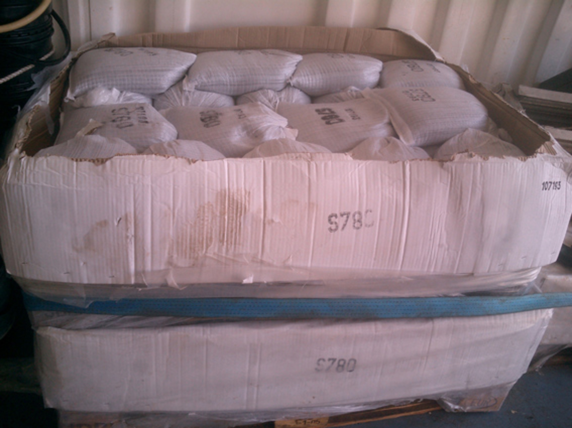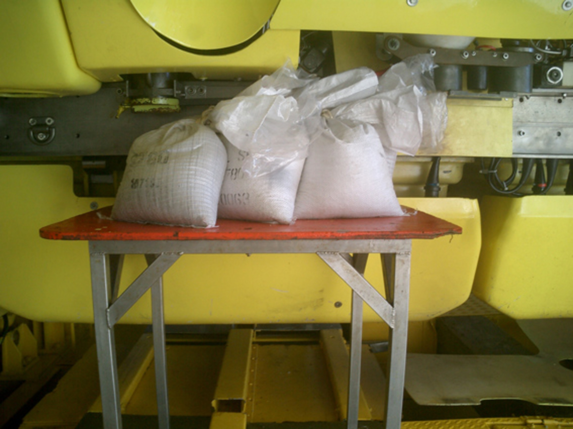 A bordo se encuentran estibadas muchas cajas con el lastre que requiere el Nautile. | Preparando el lastre que llevará el Nautile para la inmersión. |