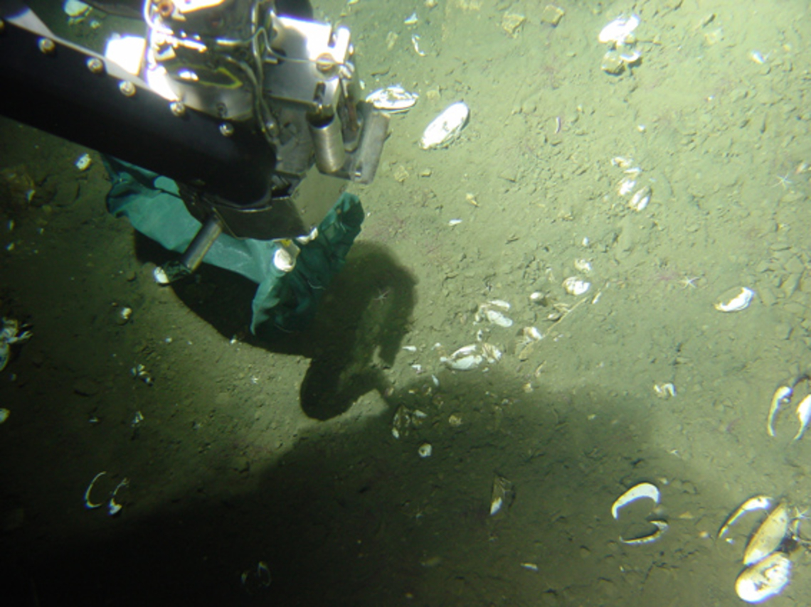 El frente del Nautile equipado para la colecta de núcleos de sedimento uno de muchos posibles tipos de muestreo. | La colecta de bivalvos Vesicómyidos requiere mucha destreza para recuperar una excelente muestra. |