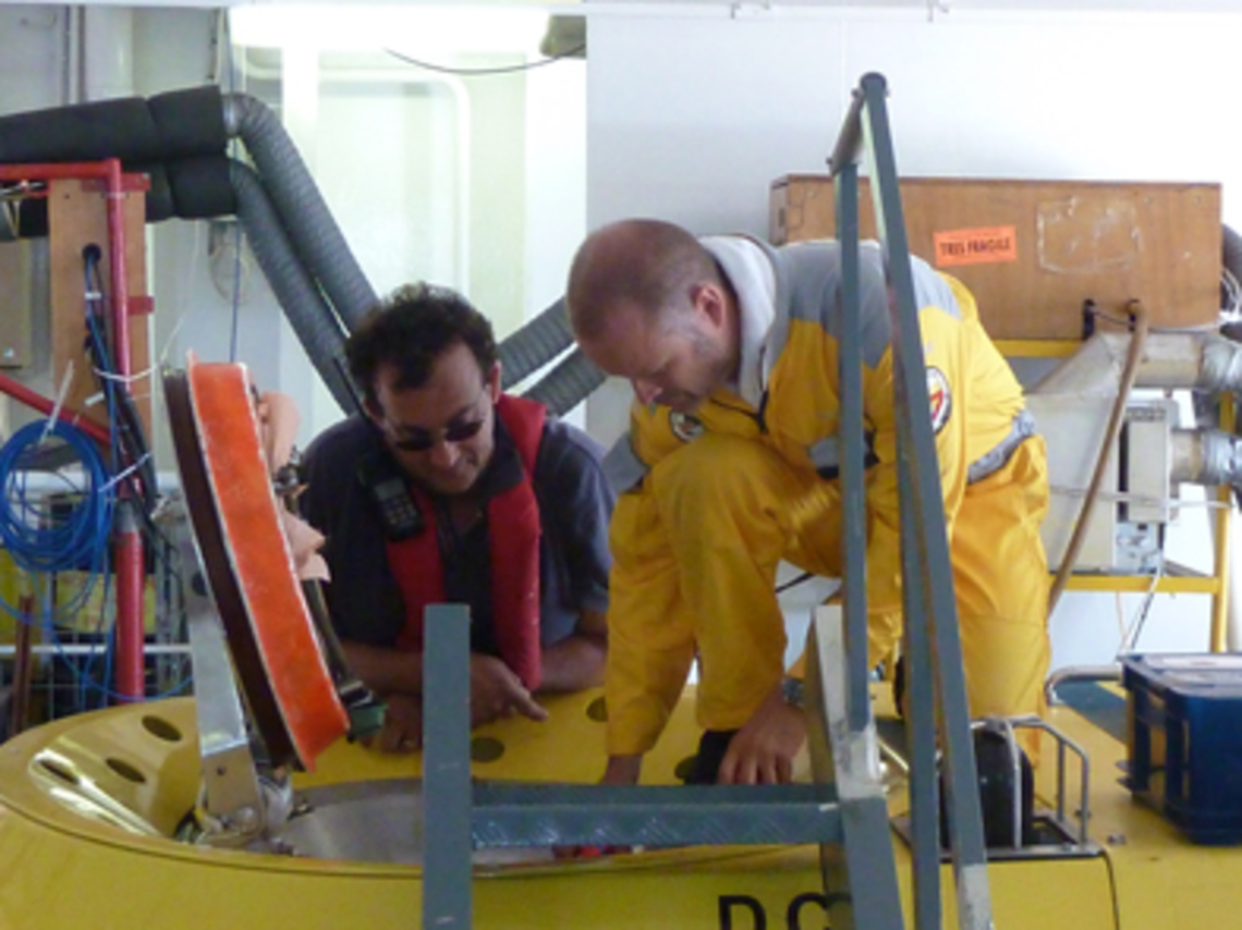 Frank et Xavier, pilotes du Nautile, font les dernières vérification du panneau d’entrée dans le submersible. |