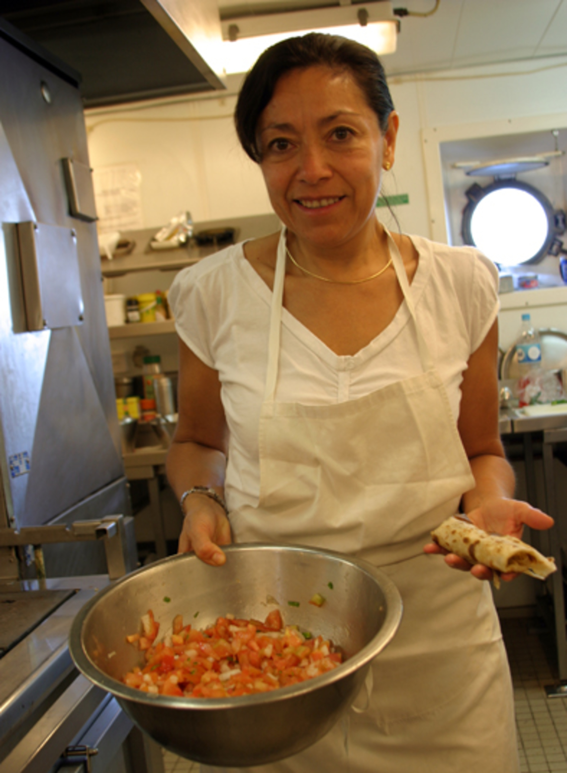 El día de hoy, Elva nos dio a probar uno de los platos regionales mexicanos. En la pasada escala en Guaymas ella adquirió los productos locales para preparar la entrada del menú de hoy: burritos de Machaca con una salsa mexicana pico de gallo.