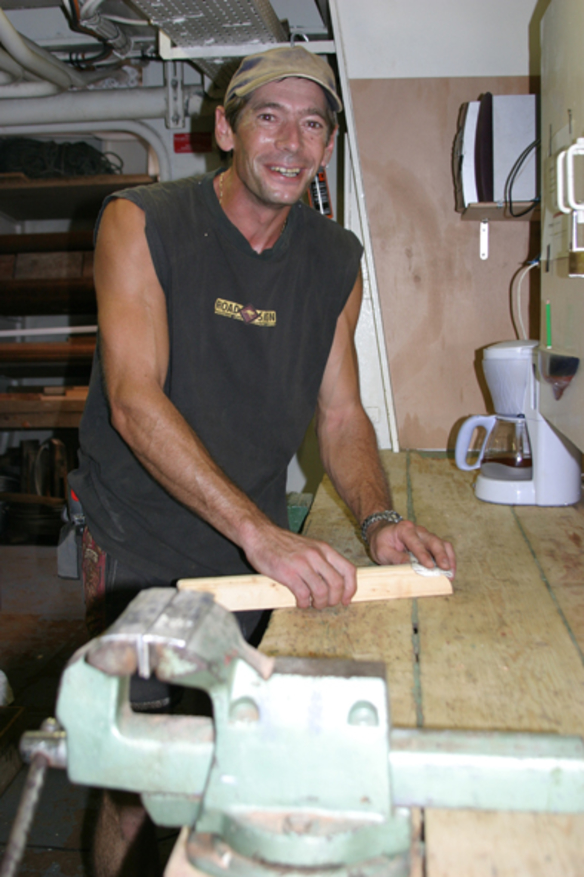 Continuando nuestro tour del buque, el equipo de cubierta está constituido de 6 a 9 personas dependiendo de la campaña y sus objetivos. Cuando el Nautile se encuentra a bordo, el grupo requerido es el “grupo pesado”. Los hombres de cubierta están a cargo de dar el mantenimiento del buque, de la preparación de los aparejos y de poner en superficie los instrumentos que utilizará el Nautile. Bérard, es el jefe de cubierta y es quien supervisa al grupo de marineros. Su puesto es inmediato al de Jean-Paul, el maestro de maniobras. Éste releva a Bérard durante el trabajo nocturno y además se responsabiliza de la seguridad a bordo del buque L’Atalante. Cuando el trabajo a bordo requiere realizarse a lo largo de 24 horas, el grupo de cubierta se divide en tres guardias cada una de 8 horas. Una guardia está compuesta de 3 personas. Tony es el jefe de la tercera guardia. A este equipo de guardia se unen 3 marineros que trabajan en cubierta y garantizan apoyo en el puente. Finalmente, Olivier y Fabrice, los marineros junto con Fernand, el carpintero también trabajan como apoyo a las guardias.