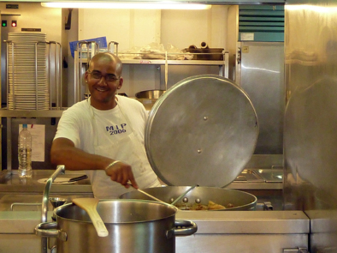 Notre tour du navire s’oriente aujourd’hui vers la cuisine, poste indispensable au moral des troupes! Le chef cuisinier c’est Jacques. En plus de diriger son équipe de 8 personnes, il planifie les repas et commande les vivres. Il est épaulé par Laurent et Julien, le second et le troisième cuisinier. Ensemble, les trois cuisiniers ont 60 personnes à nourrir à bord. Leur équipe est friande d’épices comme le témoignent ces mets souvent exotiques : poulet Colombo, soupe mulligatawny, poisson à la tahitienne, mahi-mahi au soyo et brochettes sosatis.