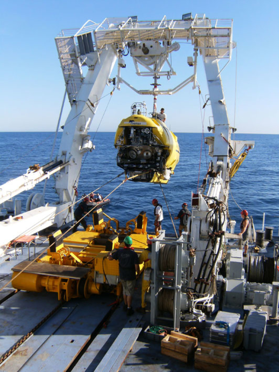 Mise à l'eau du Nautile à 10h. Cette première plongée dédiée à l'exploration nécessite l'œil aguerri d'un géologue expérimenté. C'est Yves l'heureux élu, accompagné des pilotes Franck et Yann. Pendant ses 8 heures au fond, le sous-marin habité reste en contact avec la surface grâce à un téléphone acoustique appelé le tunx.