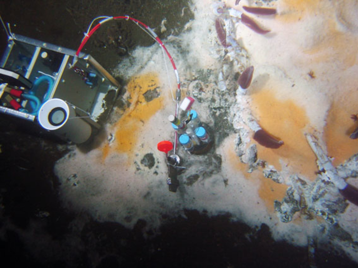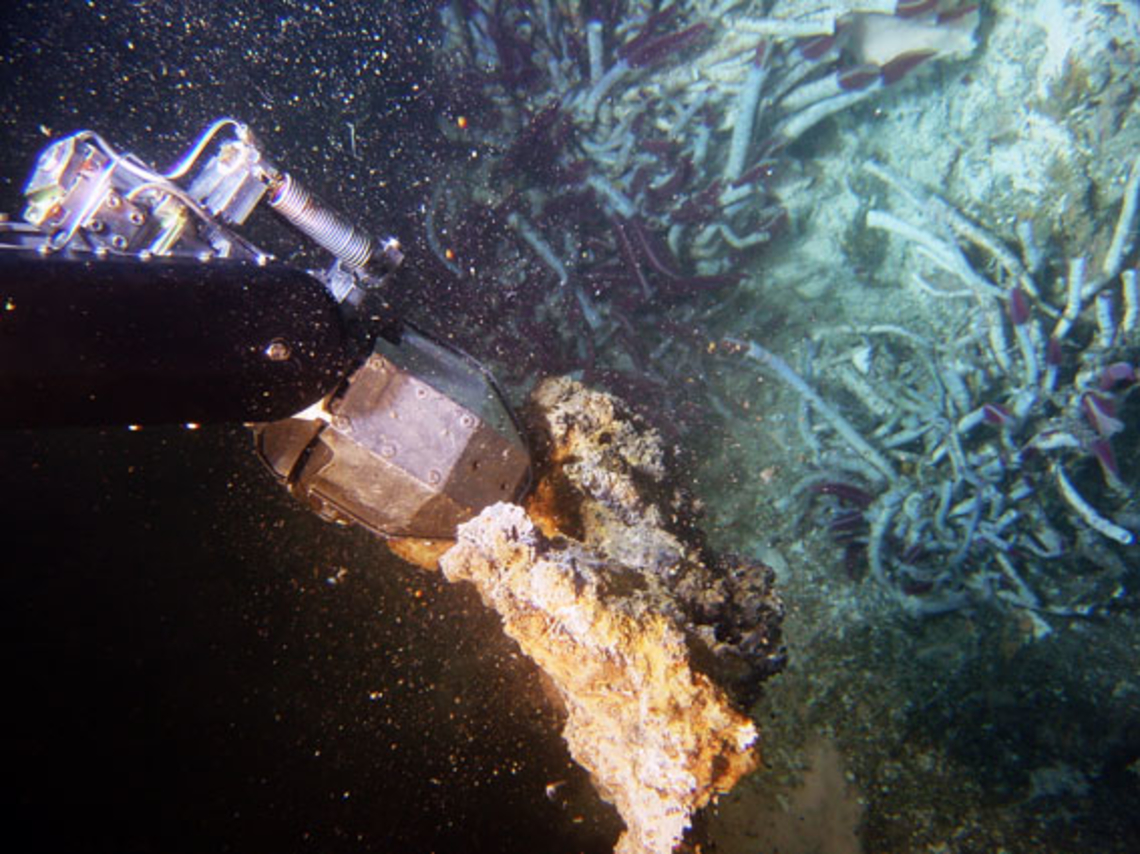 Leyenda : ramo de gusanos gigantes Riftia pachyptila y tapete microbiano en los sitios hidrotermales activos de Southern Trough.