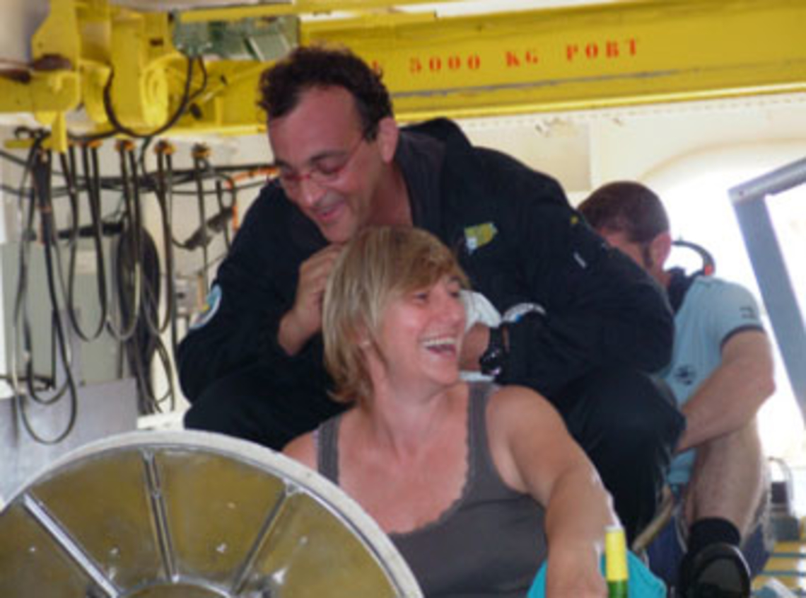 Essais de pompage avec le préleveur d'eau Pepito. | Anne notre chef de mission rentre dans le Nautile pour la deuxième plongée de la campagne. |