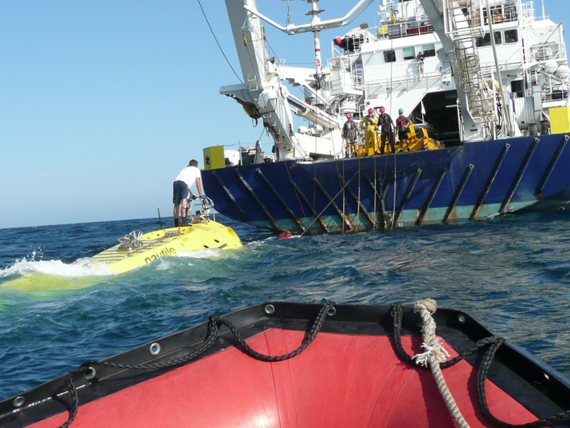 Légende : Le zodiac récupère le Nautile à l’arrière de L'Atalante.