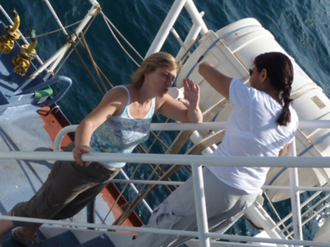 Ces jours-ci, nous avons eu quelques visites inopinées : un goéland est venu se poser sur L'Atalante, deux coryphènes nous ont surpris à l’arrière du navire, un vol de pélican a survolé la plage avant, et un troupeau de globicéphales nous a croisé !