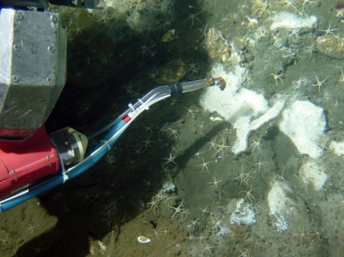 La inmersión de Karine en el margen de Sonora nos siguió trayendo sorpresas. Finalmente nos trajo imágenes de las zonas donde se agregan los gusanos Siboglinidos de las infiltraciones frías. Éstos están emparentados con los gusanos Riftia pachyptila que observamos en gran abundancia en «Southern Trough». Uno de los objetivos de la campaña es comparar la distribución y el hábitat de especies emparentadas que colonizan las infiltraciones frías y las ventilas hidrotermales. Un estudio detallado de dos ecosistemas se realizará en el transcurso de las etapas 2 y 3 de esta campaña. Esta inmersión ha permitido probar in situ el analizador de características químicas del agua CHEMINI y obtener muestras de la fauna. Entre la fauna más característica de estas infiltraciones encontramos las pequeñas arañas de mar (ofiuroideos) que cubren el sedimento en las inmediaciones del tapete microbiano y que se colectaron con la aspiradora del sumergible.