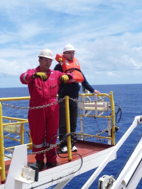Joe Monaco, est professeur à l’université de Redlands East Valley High School. Il assure le contact avec le continent américain sous forme de visioconférences (ci-contre, il semble avoir trouvé une bonne liaison satellite, debout à l’avant du navire). Il a également créé un blog en anglais consacré à la mission (http://joidesresolution.org) et m'a fait figurer dans une des pages ... merci !