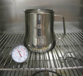 - Chauffer à l’étuve à 110°C un mélange lacté composé de 1/3 de crème et 2/3 de lait 2% gras