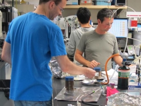 Les géochimistes et les microbiologistes ont passé trois bonnes journées dans la chambre froide à 4°C pour venir à bout des 40 mètres de tubes de carottes. Les tranches de carottes Whole Round Core (WRC) de 5 ou 10 cm de long sont soit congelées à -80°C pour les études moléculaires, soit immédiatement sous-échantillonnées stérilement. Les échantillons de sédiments sont finalement conditionnés dans des flacons en verre pour la mise en culture. D’autres échantillons sont directement étalés sur des géloses dans des boites de pétri.