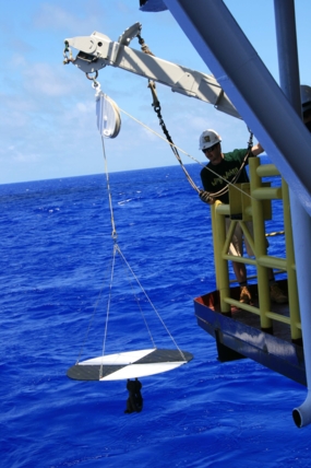 La clarté des eaux est estimée visuellement à l’aide d’un petit disque métallique noir et blanc qui est abaissé dans l’eau de surface à partir du navire. Pour le site SPG6 par exemple, ce petit disque est encore repérable à partir de la surface jusqu’à 42 mètres de profondeur : c’est probablement aussi clair qu’une piscine. Dimanche dernier, en plus de l’exercice d’abandon, nous avons également enfilé la combinaison de survie, dite combinaison sèche car l’eau n’y pénètre pas. C’est une précaution supplémentaire que le commandant nous suggère très justement car plus nous progressons dans notre aventure, c’est-à-dire vers le sud du Pacifique, plus les eaux de surface se refroidissent. D’ailleurs la température de l’air sur le pont est relativement fraîche, autour de 18°C, par rapport à ce que nous avons connu au début de l’expédition. Le commandant a donc mis à notre disposition les fameuses combinaisons afin de se familiariser avec l’étape d’enfilage qui demande une certaine dextérité et de la souplesse.