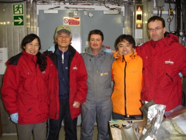 Les scientifiques ainsi que les co-chefs de missions sont contents du travail effectué et de l’esprit d’équipe. La dernière carotte est aussi l’occasion de faire une photo souvenir de l’équipe de « découpe » des carottes en chambre froide. Nos collègues de l’équipe de nuit nous rejoignent également pour une photo du groupe de microbiologie dans son intégralité.