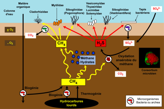 L’apport de méthane est à l’origine du développement de communautés microbiennes, qui réalisent la chimiosynthèse et sont les premiers maillons de la chaîne alimentaire. Ces écosystèmes sont en grande partie indépendants de la production primaire de surface, comme ceux des sources hydrothermales sur les dorsales océaniques. La chimiosynthèse est à la base du développement des communautés animales qui contribuent, par leur originalité à la biodiversité des marges continentales. Du fait de leur lien avec les hydrocarbures, ces écosystèmes sont susceptibles d’être endommagés par les activités pétrolières en grand fond.