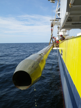 Tout de suite après la remontée de Victor 6000, l’équipage se mobilise pour mettre à l’eau le grand carottier Calypso. Déployé par dessus bord, ce carottier permet de recueillir de longues carottes de sédiments marins. La cible d’aujourd’hui est située à l’extérieur de la zone active de REGAB. Livio, Jean-Claude et Germain s’activent sur le pont, impatients de recueillir leur premier échantillon. Le but de cette opération et des suivantes sera de comparer les processus géochimiques et les flux de méthane à l’intérieur et à l’extérieur du pockmark REGAB. « Dans cette carotte de 8 m, on s’attend à ce que ça ne soit quasiment pas actif car nous sommes à 300 m de la structure » dit Livio.