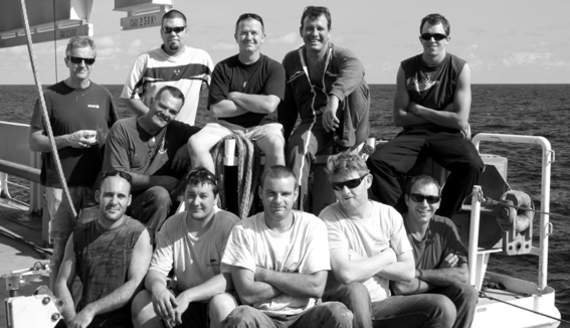 - arrière : Olivier (matelot), Jérôme (matelot), Erwan (maître de pont), Serge (matelot), Jean-Baptiste (matelot)