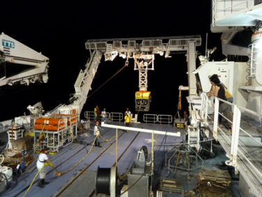 Ce n’est que tard dans la soirée que Victor est enfin prêt pour sa 3ème plongée. L’objectif majeur est de caractériser l’habitat colonisé par les bivalves Vésicomyidés. Plusieurs instruments, dont le microprofileur, sont mis en œuvre pour mesurer les conditions physico-chimiques à proximité de la faune. Ce dernier permet de mesurer les concentrations d’oxygène et d’hydrogène sulfuré ainsi que la température et le pH à l’intérieur des sédiments. La faune est ensuite récoltée à l’aide de carottiers de différentes tailles.