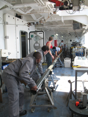 Pendant que l’équipe du sous-marin Victor 6000 reconditionne le véhicule pour sa prochaine plongée, un carottage Calypso est effectué au centre du site actif, afin de recueillir des hydrates de gaz. Ces composés solides naturels ont l'apparence et la consistance de la glace. Ce sont des molécules de gaz (comme le méthane) entourées par un réseau de molécules d'eau disposées en cage.