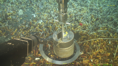 Après l’étude de l’habitat des Vésicomyidés, la plongée s’est poursuivie toute la nuit. Le deuxième objectif est de caractériser l’habitat des modioles (genre de moules) de l’espèce Bathymodiolus aff. boomerang selon un protocole bien précis. Un cercle d’aluminium de taille connue est d’abord déposé pour délimiter la zone d’échantillonnage. Puis, des prélèvements d’eau, à l’aide du préleveur PEPITO, sont effectués sur plusieurs points à proximité des organismes. La faune de petite taille et les espèces vagiles sont ensuite récoltées à l’aide d’un aspirateur à faune. Enfin, un carottier spécial, adapté à un substrat plus ou moins meuble, est déployé à l’intérieur du cercle pour échantillonner la faune de grande taille. La cicatrice laissée par cet échantillonnage est étudiée pour vérifier que toute la faune a effectivement été prélevée. L’ensemble de ces données permettront de décrire la composition des communautés associées aux modioles ainsi que l’habitat dans lequel elles vivent.